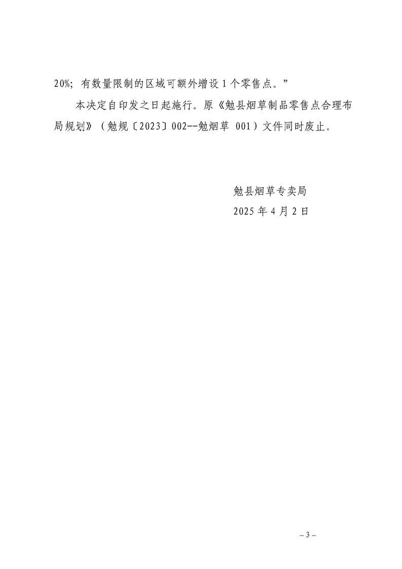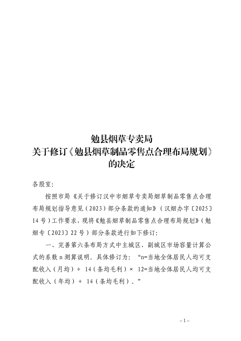 勉县烟草专卖局关于修订《勉县烟草制品零售点合理布局规划》的决定